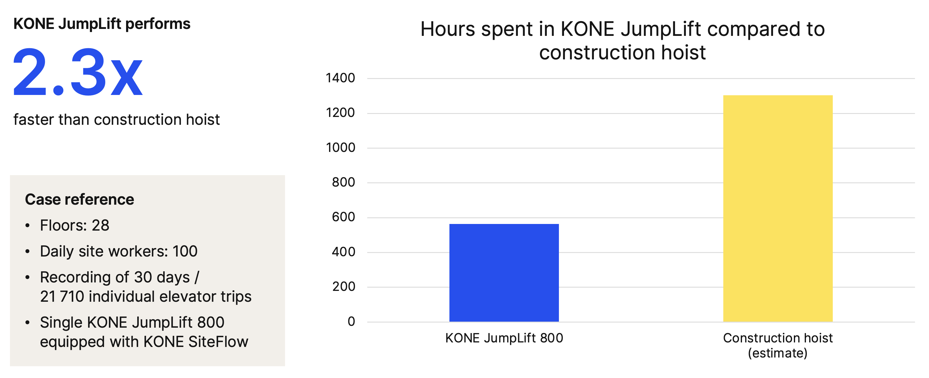 KONE JumpLift with KONE SiteFlow is accelerating construction logistics using automation and digitalization to improve process, increase productivity, reduce cost, ensure safety, and bring ease to working conditions.